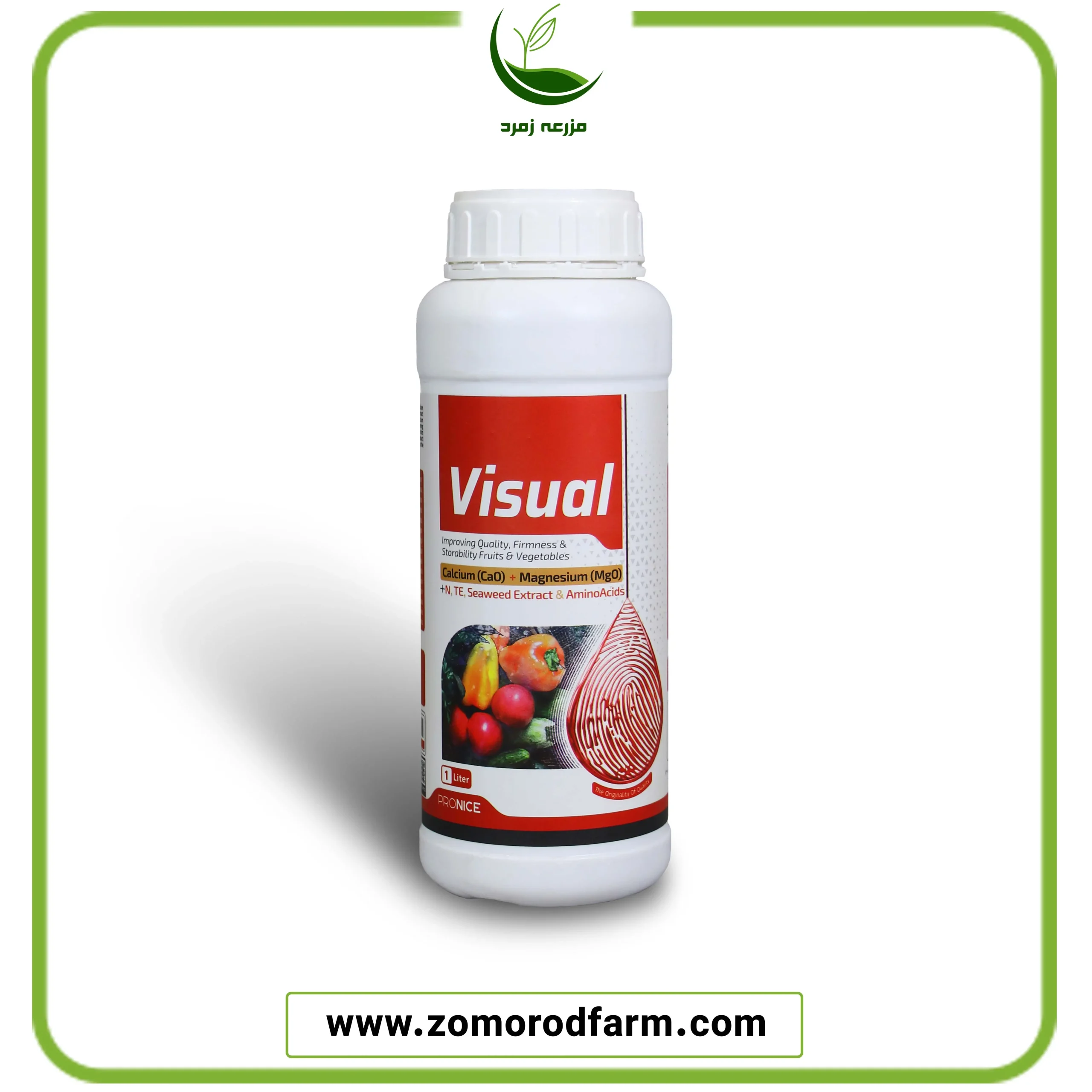 ویژوال حاوی درصد بالا و غلیظ از کلسیم به همراه ازت، منیزیم، عناصر ریزمغذی به همراه عصاره جلبک دریایی و اسید آمینه آزاد میباشد. کود ویژوال سبب پیشگیری از بروز علائم کمبود کلسیم در گیاه شامل ترک خوردگی، لهیدگی،سوختگی گلگاه و حاشیه برگ میشود و همچنین سبب سفت شدن جوانهها، دمگل در میوه و جلوگیری از ترک خوردگی و ریزش میوهها در برابر باد میگردد. این محصول همچنین سبب سفت شدن، استحکام و بازارپسندی میوه شده و کیفیت و خاصیت انبارداری محصول ا افزایش میدهد.